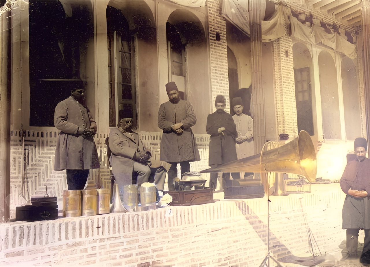 Sous les arcades du palais du Golestan, le Shah, entouré par ses collaborateurs vient de recevoir le précieux chargement constitué du Multiplex Grand et de ses cylindres, commandés en juin 1900 durant l'Exposition.