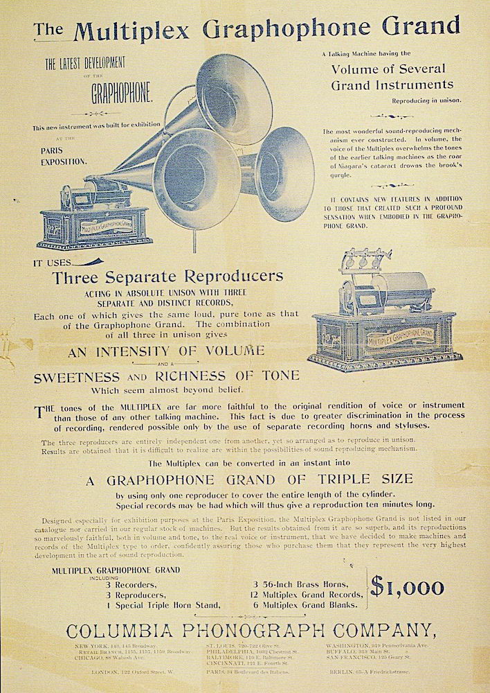 En 1904, un troisième modèle équipé de trois grands pavillons et de trois reproducteurs de type AW sera présenté lors de la St Louis World's Fair.Avec ses accessoires, 12 cylindres enregistrés et 6 vierges, le phonographe coûtait 1 000 dollars. Autant dire que les amateurs prêts à débourser cette somme ne se bousculaient pas.Les articles de presse de ce début de siècle révèlent que la Columbia n'a construit que quelques unités du Multiplex Grand, conçu à l'origine pour être exposé :- celui de l'Exposition de Paris 1900